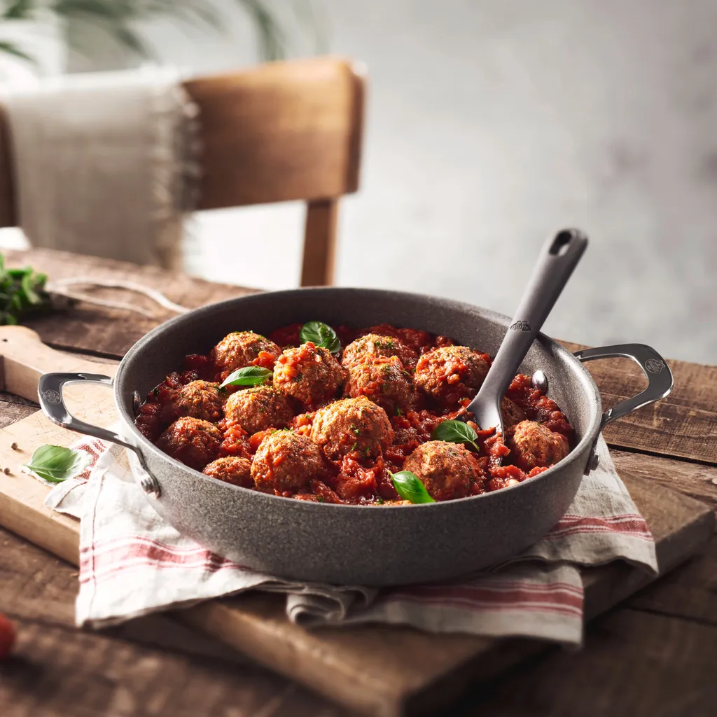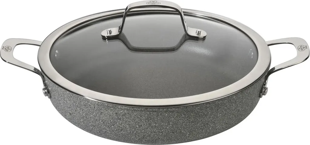 Mit der Servierpfanne mit Glasdeckel der Serie Salina von BALLARINI mit 28 cm Durchmesser schaffst du Momente des Glücks: Die ganze Familie sitzt am Tisch, in der Mitte eine große Portion Pasta Bolognese – und alle bedienen sich nach Lust und Laune. So schön und lebendig kann Kochen sein! Mit ihrem Granit-Look macht sich die Servierpfanne optisch besonders gut auf deiner Tafel. Maße: Ø 28 x 7,7 cm