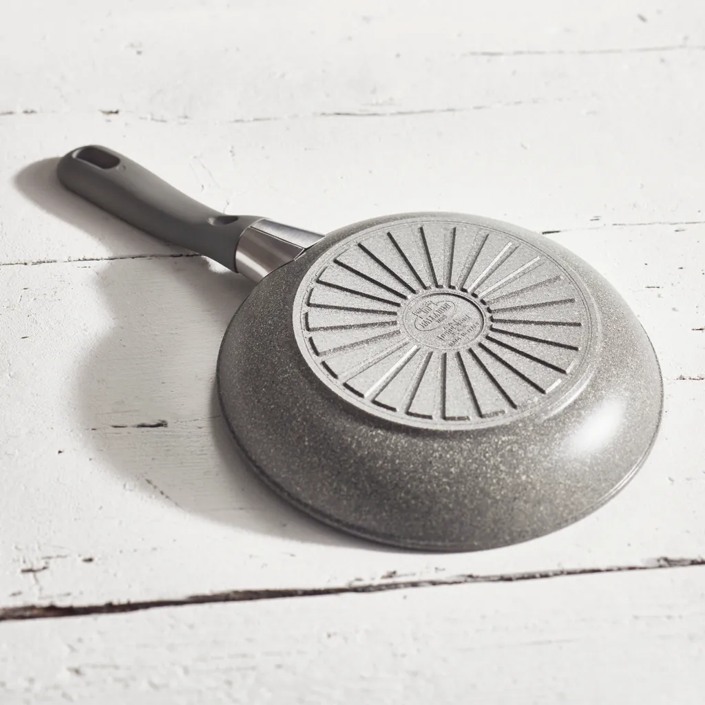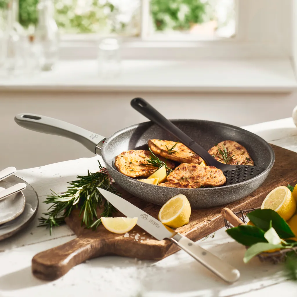 Entwickelt wurde das schöne Design des Kochgeschirrs im Granit-Look vom Mailänder Studio Matteo Thun & Antonio Rodriguez. Kratzfest und einfach zu reinigen ist die Pfanne dank der langlebigen, mit Mineralpartikeln verstärkten 5-Lagen-Antihaftbeschichtung GRANITIUM Extreme. Spülmaschinengeeignet ist die Pfanne dabei ebenfalls. Das hochwertige Material aus massivem, geschmiedetem Aluminium spart wertvolle Zeit beim Aufheizen. Induktionsgeeignet? Auf jeden Fall! Wenn du einen Induktionsherd hast, kannst du sogar zusätzlich Energie sparen, denn der Radiant Induktion Boden verteilt die Wärme ideal und spart somit Energie. Der praktische Thermopoint am Stiel wechselt die Farbe, wenn die ideale Brattemperatur erreicht ist.