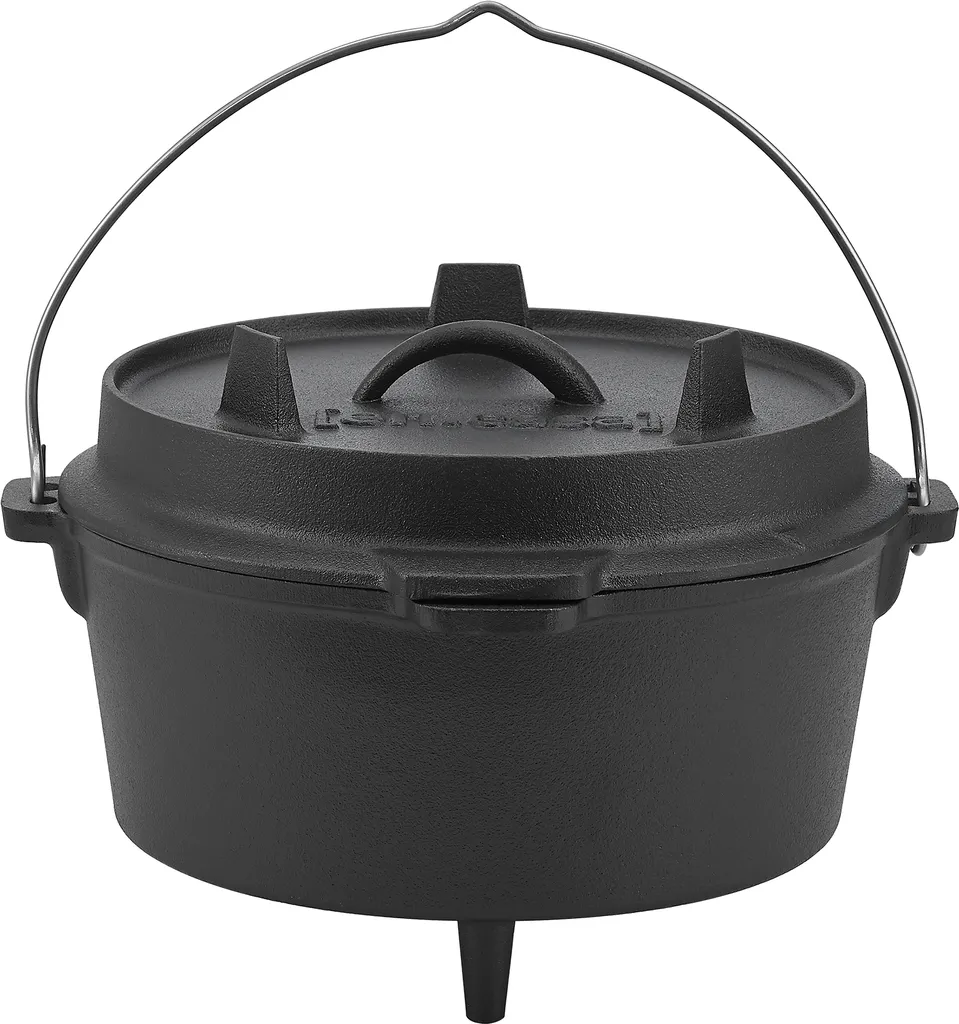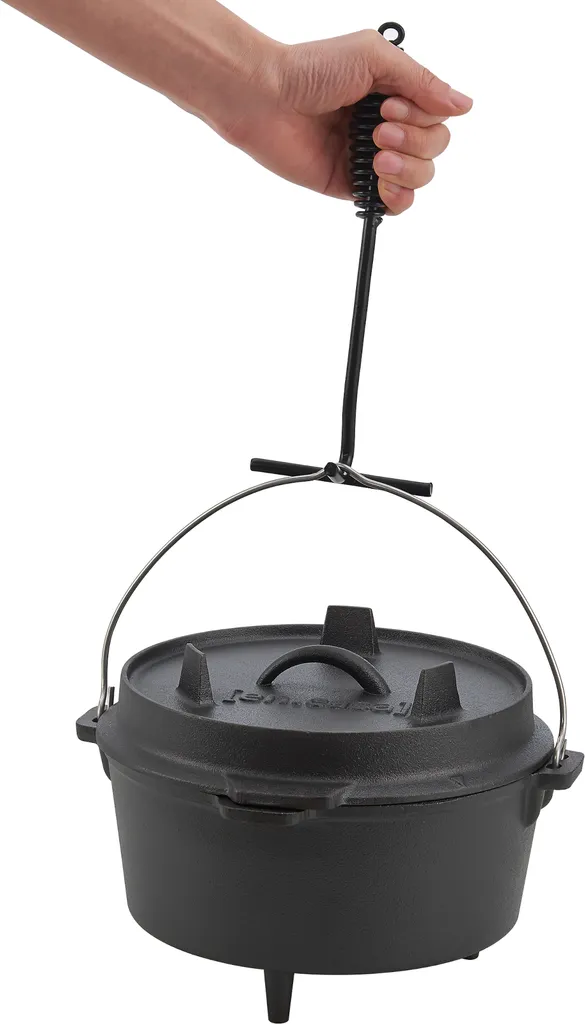 Der Kochtopf aus Gusseisen ist ein Multifunktionstalent und lässt sich bspw. als Schmortopf, Gulaschkessel oder Brotbacktopf verwenden. Glut, glühende Kohlen oder Grillbriketts können direkt auf dem Deckel oder unter dem Topf platziert werden. Der Dutch Oven ermöglicht ein gleichmäßiges Garen und verfügt darüber hinaus über einen Deckelheber.