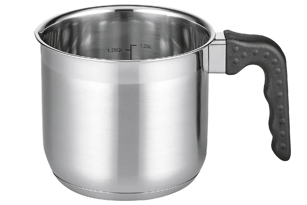 Milchtopf aus Edelstahl 18/8 – Ø 14 cm, Kapsel-Sandwich-Boden mit Aluminium-Kern, zylindrische Form mit Abgießrand, innen hochglanzpoliert, mit integrierter Volumenskala, mit integriertem Öl-Dosier-System, außen satiniert mit hochglanzpoliertem DeKo-Rand, rutschfeste schwarze Kunststoffgriffe mit Edelstahlflammenschutz, hochgewölbter Glasdeckel mit stoßfestem Edelstahlrand und Kunststoffknopf, mit Fingerschutzplatte, spülmaschinengeeignet, für alle Herdarten geeignet, auch für Induktion