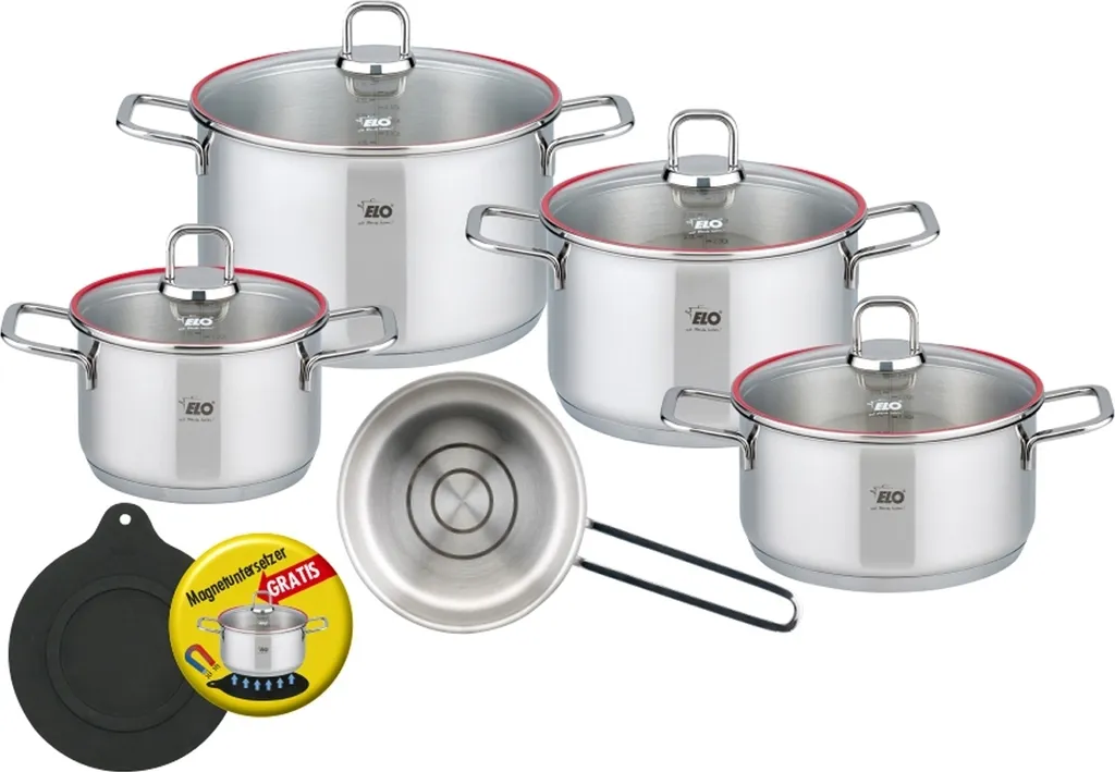 Topfset Excellent 6-teilig aus hochwertigem Edelstahl 18/8, Wandstärke ca. 0,7 mm, Gesamtbodenstärke ca. 5,5 mm, innen satiniert, außen hochglänzend poliert, bestehend aus: 1x Bratentopf 20 cm, je 1 Fleischtopf 16, 20 und 24 cm, 1x Stielkasserolle 16 cm, 1 x magnetischer Silikon Topfuntersetzer Ø 21 cm. Das Topfset Excellent ist mit der einzigartigen ELO Dosierhilfe für Öl in Form von 2 Ringen ausgestattet. Damit wird die Dosierung von Bratölen und flüssigen Bratfetten ein Kinderspiel. Der kleine Ring entspricht ca. einem Teelöffel Öl, der größere Ring ca. einem Esslöffel Öl. Der moderne und stoßfeste Glasdeckel mit rotem Silikonring sorgt für perfekten Sitz und hat ein extra großes Lüftungsloch für kontrolliertes Abdampfen. Energiesparender Kapselboden für wasserarmes und vitaminschonendes Garen | Eingearbeitete Volumenskala in allen Töpfen | Integriertes Öl-Dosiersystem (Oil Optimizer) | stoßfeste Glasdeckel mit rotem Silikonring und extra großem Entlüftungsloch für kontrolliertes Abdampfen | backofenfest bis 240 °C (mit Glasdeckel bis 180 °C) | für alle Herdarten geeignet, auch Induktion.