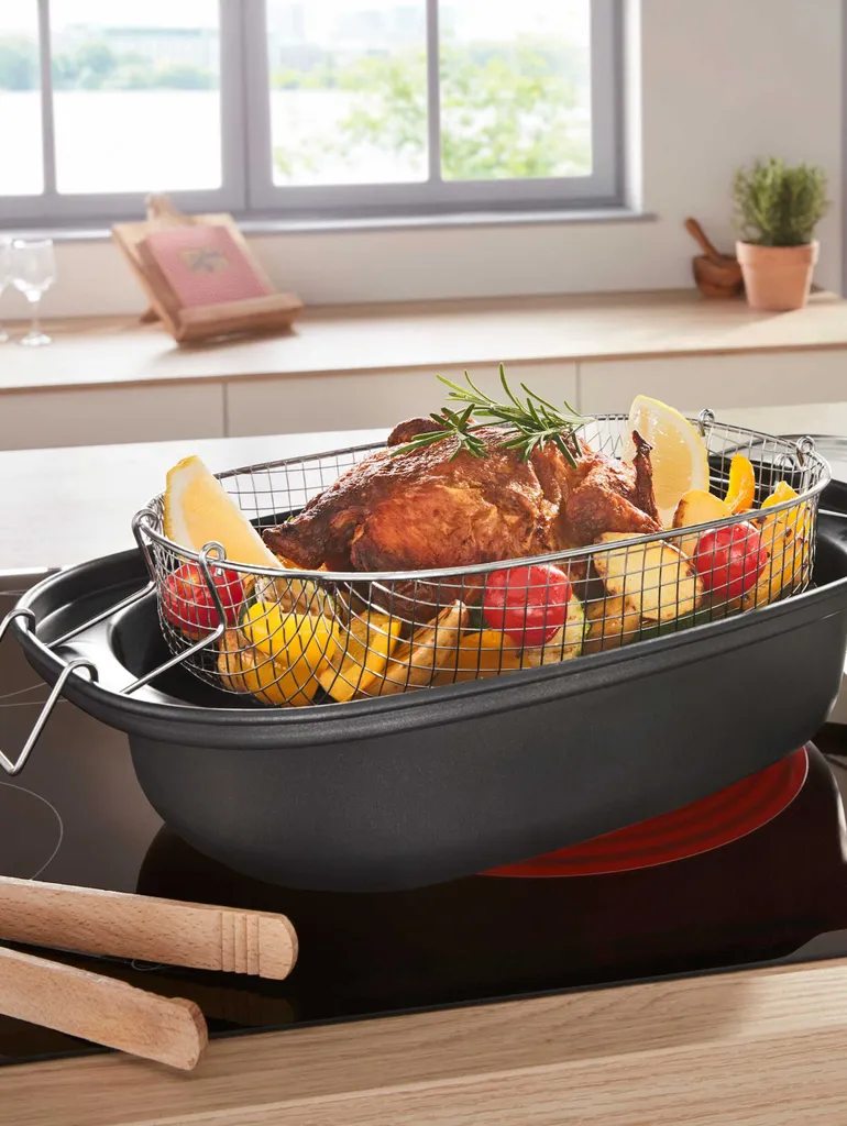 Dieser Bräter ist aus robustem, extra schweren Kohlenstoffstahl gefertigt und verfügt über einen Einsatz zum Frittieren und Dünsten. Die langlebige Antihaft-Versiegelung ist ideal zum Braten, Schmoren oder Dünsten auf dem Herd oder im Backofen und zudem leicht zu reinigen.