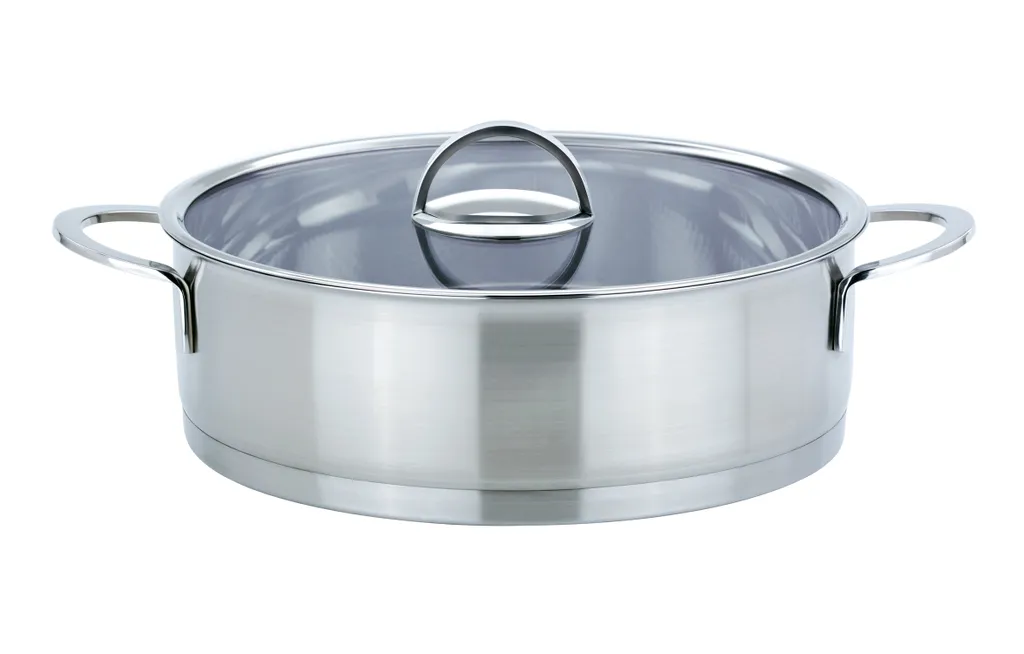 Beschreibung: Die Brat- und Servierpfanne ist aus hochwertigem Edelstahl rostfrei 18/8 gefertigt und verfügt innen über einen Wabenboden zur besseren Öl- und Fettverteilung beim Braten. Die vorhandene Literskala, der extra starke, energiesparende Kapselboden und die handfreundlichen Kaltmetallgriffe sorgen für einen großen Spaß beim Kochen. Die Pfanne ist für alle Herdarten – auch für Induktion geeignet.