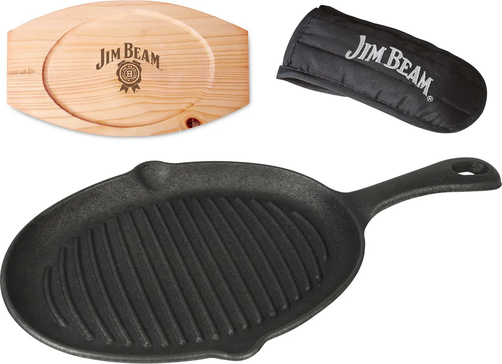 - Gusseiserne Jim Beam Grillpfanne mit Griffüberzug und Servierbrettchen