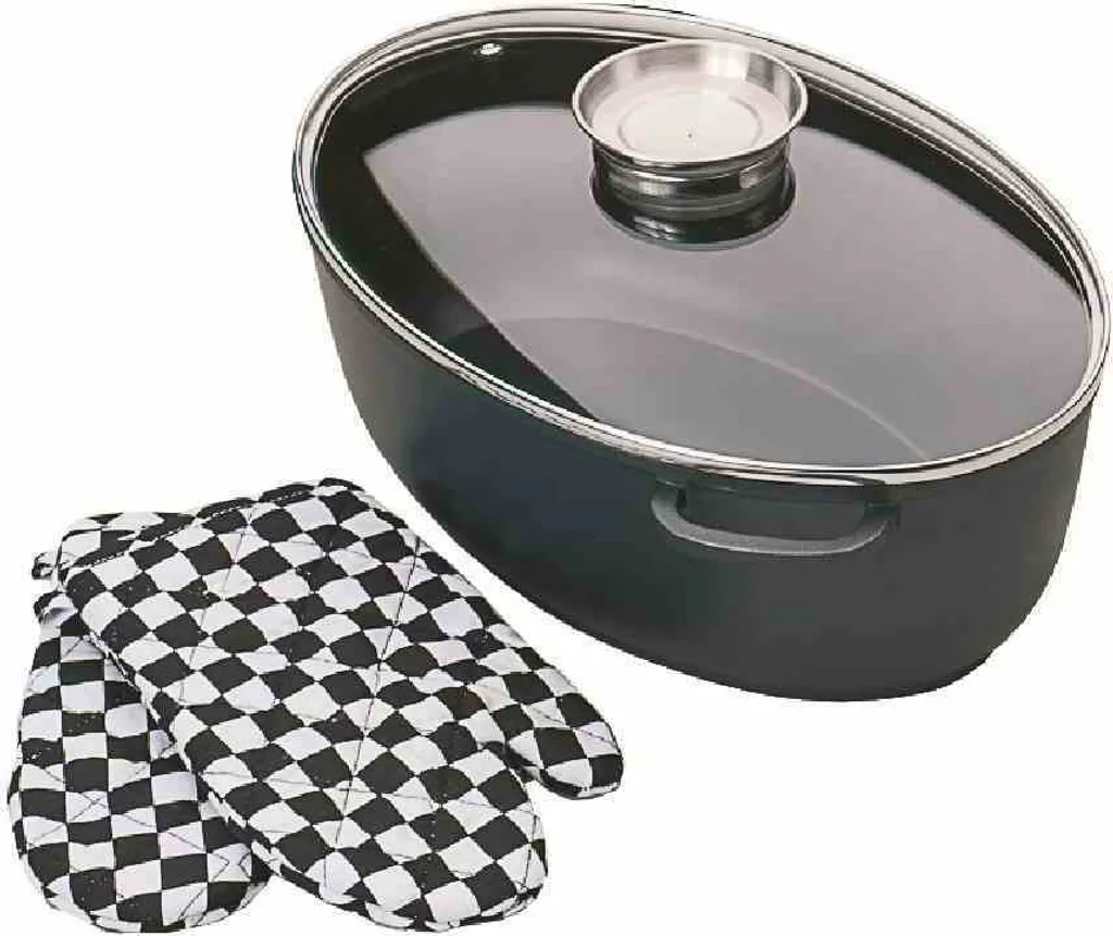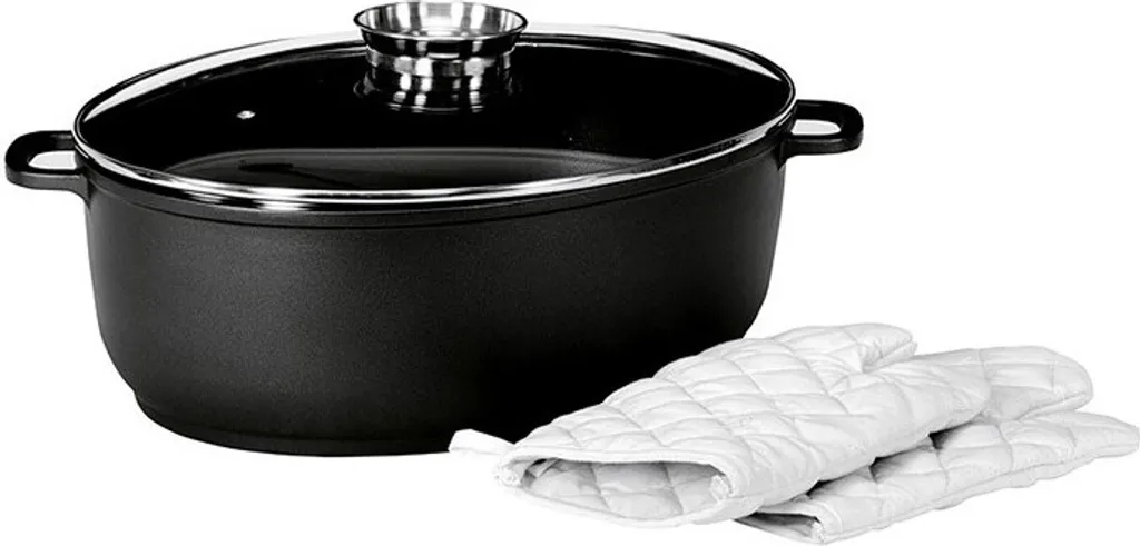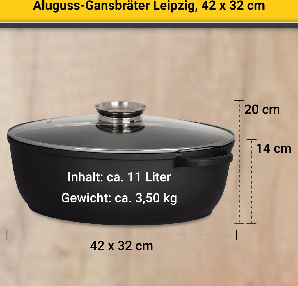 Lieferumfang: 1x Gänsebräter Leipzig mit Glasdeckel, 42 cm (inkl. 1 Paar Handschuhe)