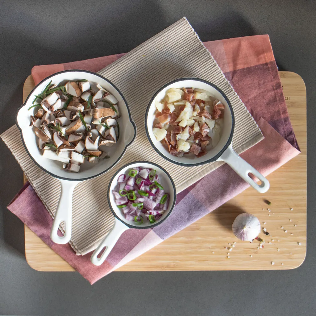 Das größte Pfännchen verfügt über zwei seitliche Ausgießkerben zum vereinfachten Abgießen von Soßen und Flüssigkeiten. Die Pfännchen können auch ideal zum Servieren verwendet werden.