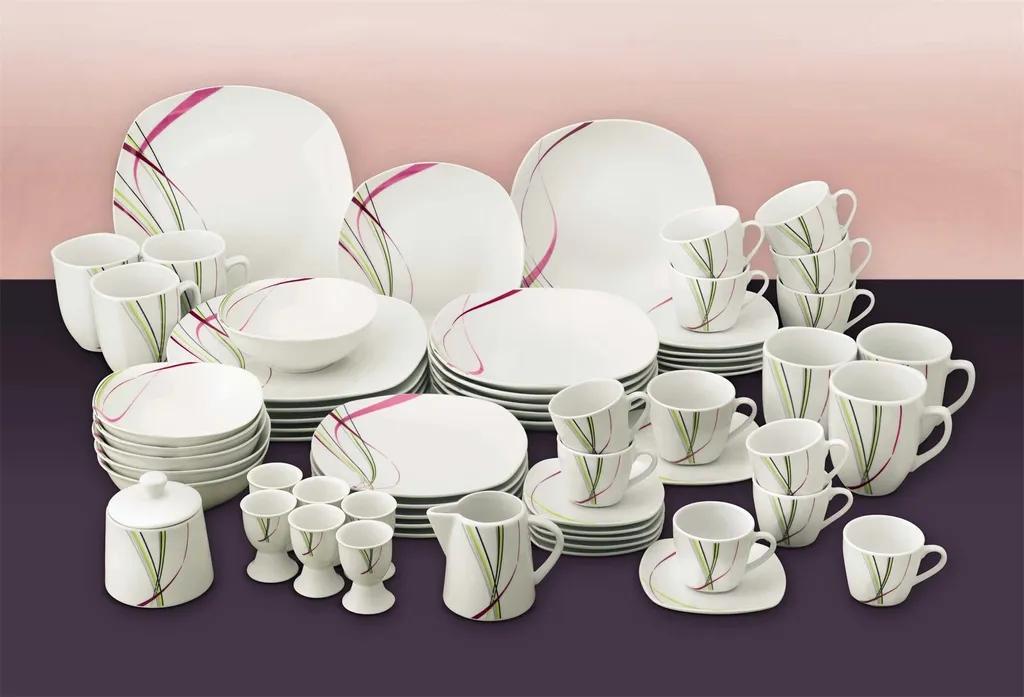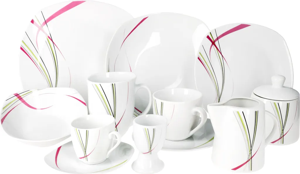 Die moderne Geschirrkollektion Fashion wirkt anmutig, sanft und wild zugleich. Ein erfrischendesNachbildung, denn schleierförmig tanzen Streifen über das lichtgraue Porzellan und zieren in Pink, Grün, Grau und Schwarz die insgesamt 62 Einzelteile der abstrakten Serie. Das vorteilhafte Set bietet die optimale Grundlage zum Speisen und Anreichen vielfältiger Menüs und Beilagen!