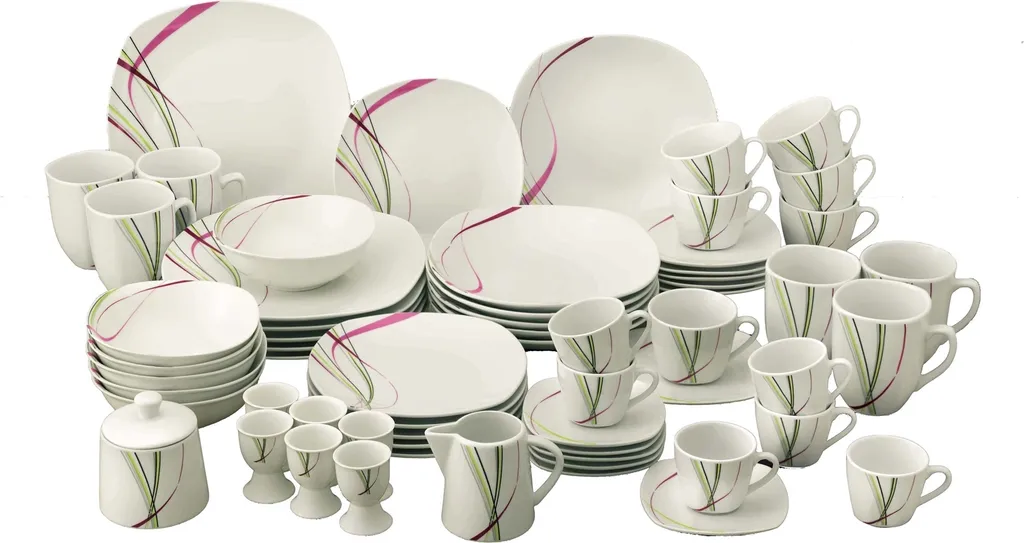 Dieses 62-teilige Kombiservice beinhaltet unter anderem Obertassen, Untertassen, verschiedene Teller, eine Zuckerdose, Eierbecher und Müslischalen in eckiger Form. Sie bestehen aus Porzellan und sind weiß mit einemNachbildung in vier Farben. Das Geschirr ist spülmaschinen- und mikrowellengeeignet.