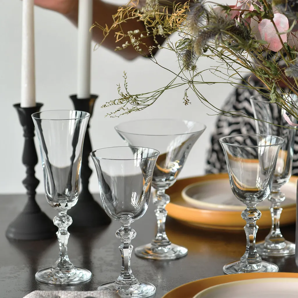 ELEGANTE FORM – Ein tulpenförmiges Glas, welches zart mit einem diamantförmigen Stiel kombiniert wird, schmückt sowohl moderne als auch klassische Innenräume.