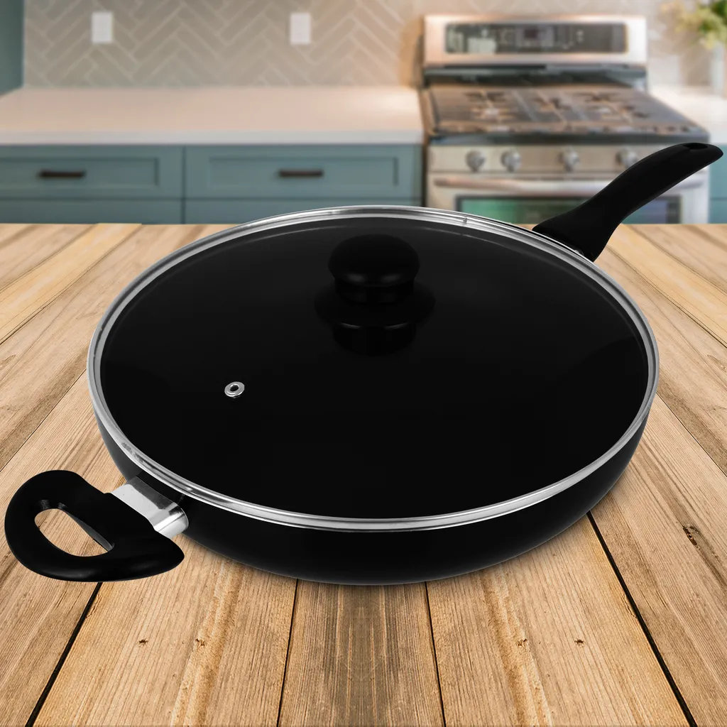 Diese Profi Aroma-Hochraumpfanne ist ideal für Großfamilien und Genießer. Das hochwertige Material nimmt schon minimale Energie blitzschnell auf und verteilt die Hitze gleichmäßig über die komplette Bodenfläche. Die Profiqualität der Pfanne ermöglicht ein langlebiges Arbeiten. Die hochwertige ILAG®-Antihaftbeschichtung ermöglicht präzises und stressfreies Arbeiten. Der lange Griff verfügt über ein Aufhänge-Loch und ein zusätzlicher Griff auf der gegenüberliegenden Seite ist vorhanden. Der Rand der Pfanne ist extrahoch. Der praktische Glasdeckel verfügt über ein Dampfloch. Kochen dank hochwertiger Beschichtung. Wasserarm garen und fettarm braten erhält Vitamine, Mineralien und Aromastoffe. Die Beschichtung enthält kein ungesundes und PTFE.