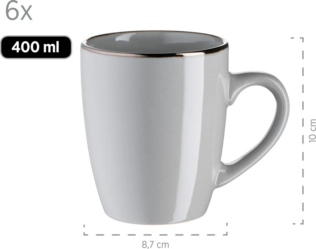 Die Kollektion METALLIC RIM der österreichischen Traditionsmarke MÄSER kombiniert auf erfrischende Weise modernes Design in Material, Form- und Farbgebung mit festlicher Eleganz. Trotz seines edlen Silberrands ist dieses Geschirrset dauerhaft spülmaschinenfest und mikrowellengeeignet, und damit äußerst pflegeleicht. So verzaubert die Serie METALLIC RIM Ihre Gäste nicht nur zu besonderen Anlässen, sondern wertet Ihren Esstisch auch im Alltag auf. Ein besonderes Highlight ist die großzügige Mehrzweckschale, die Müslischale und Suppenteller im Zeitgeist des Bowl-Trends vereint. Dieses Service wird in einer speziell für dieses Set entwickelten, vielfach getesteten Transportverpackung aus umweltfreundlicher Wellpappe versendet. Zur besseren objektiven Vergleichbarkeit gehen unsere Füllmengenangaben von einer randvollen Befüllung aus. Bitte beachten Sie: Die Serie METALLIC RIM wird händisch glasiert, wodurch leichte Unebenheiten, kleine Einschlüsse und minimale Farbabweichungen auftreten können.