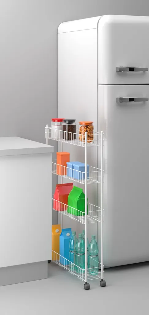 Dieser Rollwagen passt ideal in kleine Nischen. So können Sie den Stauraum, z. B. neben der Waschmaschine ausnutzen.