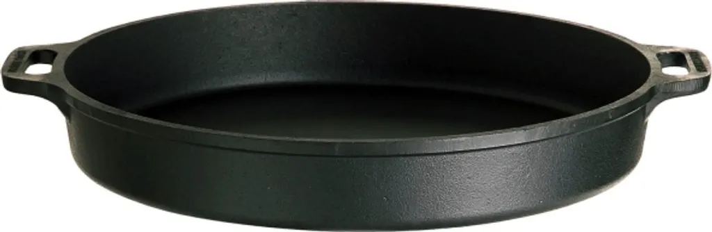 Robuste Gusseisen-Pfanne mit zwei Griffen Material: Gusseisen Form: rund Farbe: schwarz Durchmesser ohne Griffe: 50 cm Höhe: 8 cm ohne Farbe, NATURGUSS nur mit Öl eingebrannt Für alle Herdarten geeignet, inkl. Induktion. Sehr gute Wärmeverteilung bzw. Wärmespeicherung. Solide, robust und sehr strapazierfähig. Ideal zum braten und grillen. Sehr gut als Servierpfanne geeignet. Einfach zu reinigen. Vielseitige Einsatzmöglichkeiten: absolut formstabil, beste Grilleigenschaften enorme Hitzeentwicklung perfekte Wärmespeicherkapazität Alle Gussgrillplatten immer beidseitig verwendbar gewellt und glatt. Alle Gussprodukte sind vorgeglüht und in Öl eingebrannt oder geölt. Natürliche Schutzschicht. Alle Geschirre sind kratzunempfindlich! Produkthinweis: Alle unsere Gussprodukte werden einzeln von Hand für Sie gefertigt. Bedingt durch diese Handarbeit kann das Endprodukt in Form und Farbe leichte Abweichungen aufweisen (kleine Unebenheiten, Farbe). Dies hat auf die perfekten Grill-, Brat-, und Kocheigenschaften unserer Gussprodukte jedoch keinerlei Einfluss.