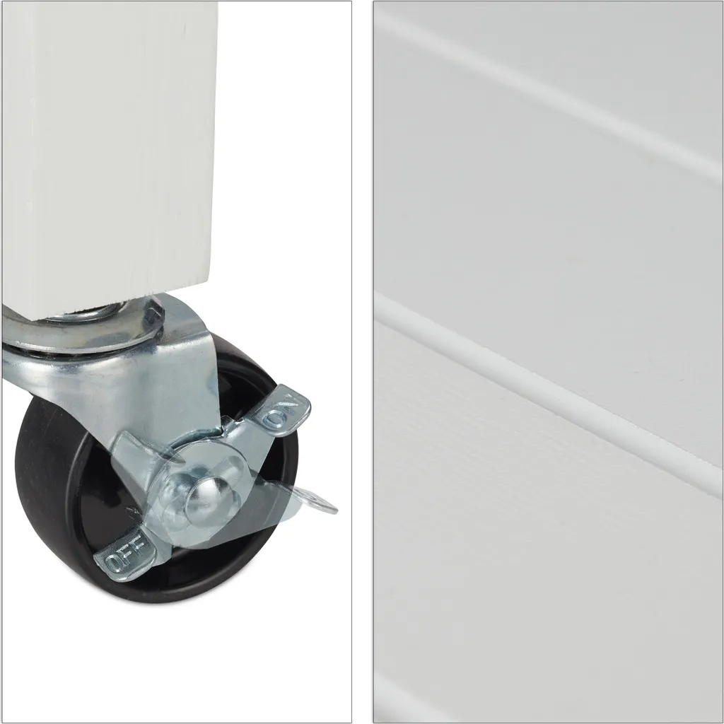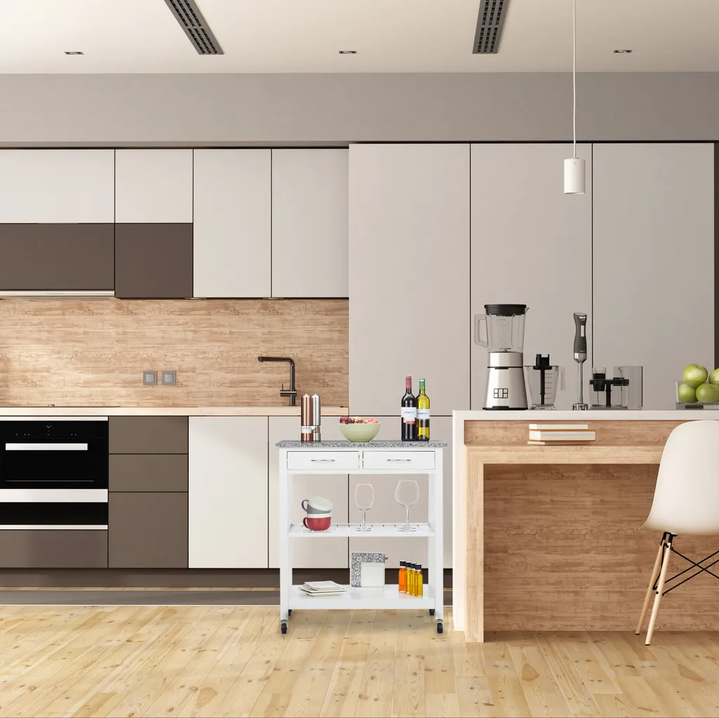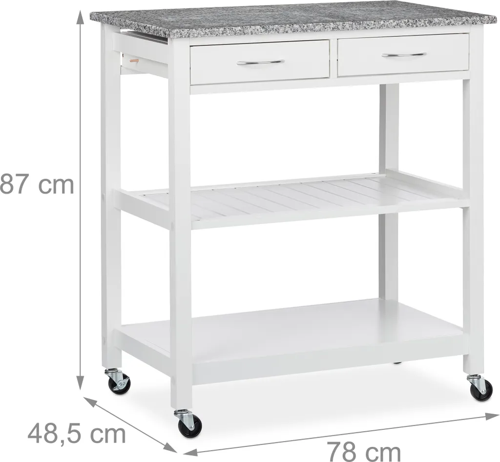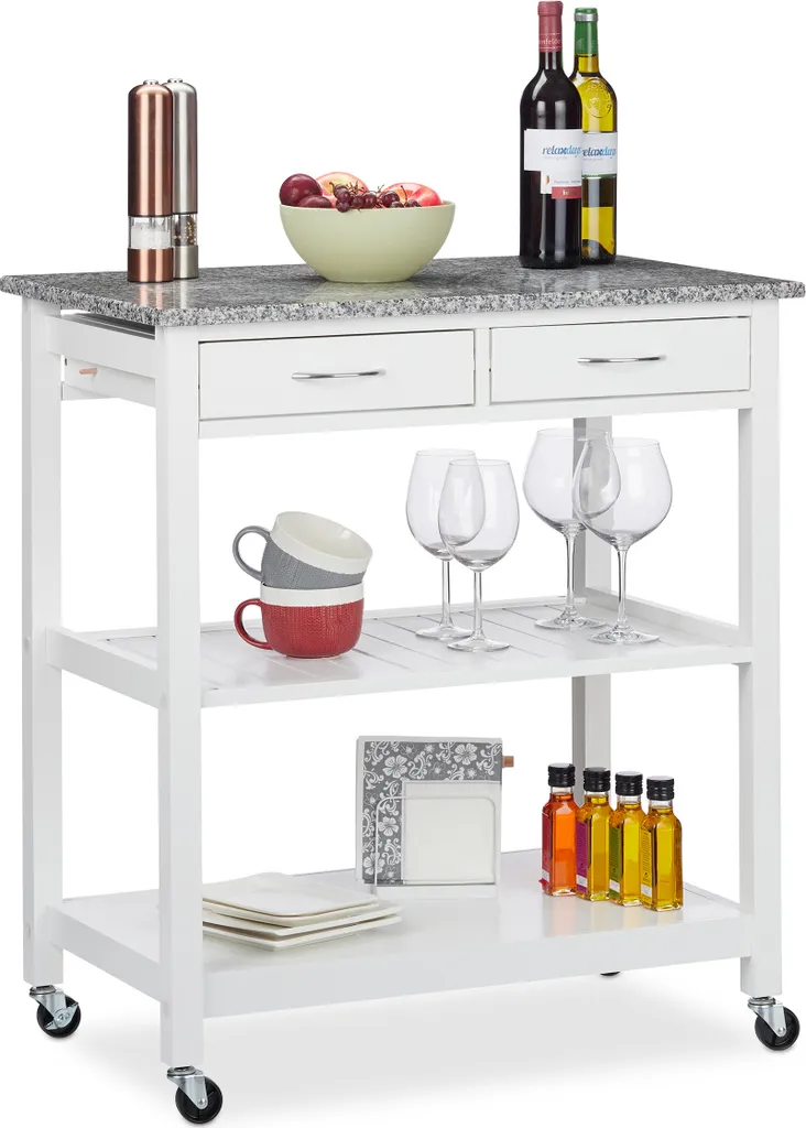 Sie möchten leckere Gerichte oder einen guten Tropfen nicht nur in der Küche oder im Wohnzimmer zu sich nehmen, sondern einfach da, wo es gerade am schönsten ist? Dann ist der weiße Küchenwagen der richtige Mitstreiter für Ihren Haushalt. Die Gelenke der Rollen lassen sich in jede gewünschte Richtung drehen, sodass nichts die Mobilität des Servierwagens einschränkt. Die große Arbeitsplatte aus Granit macht sofort Lust aufs Kochen. Für Geschirr, Besteck oder Flaschen steht jede Menge Stauraum auf 3 Ebenen zur Verfügung.