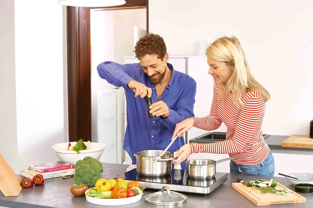 - Pfannen in hochwertiger Edelstahlqualität und mit energiesparendem Induktionsboden