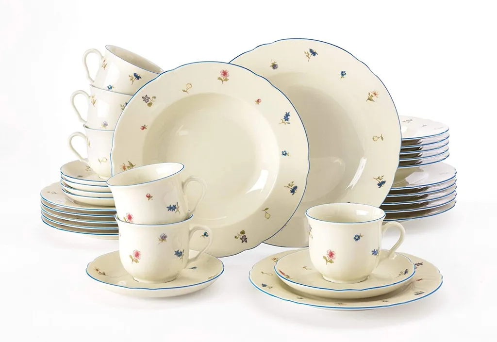1. Wahl, Porzellan, spülmaschinenfest, ofenfest, mikrowellengeeignet. Dieses Set besteht aus:6 Suppenteller 23 cm6 Speiseteller 25 cm6 Frühstücksteller 20 cm6 Kaffee-Obertasse 0,21 ltr. 6 Kombi-Untertasse 14,5 cm