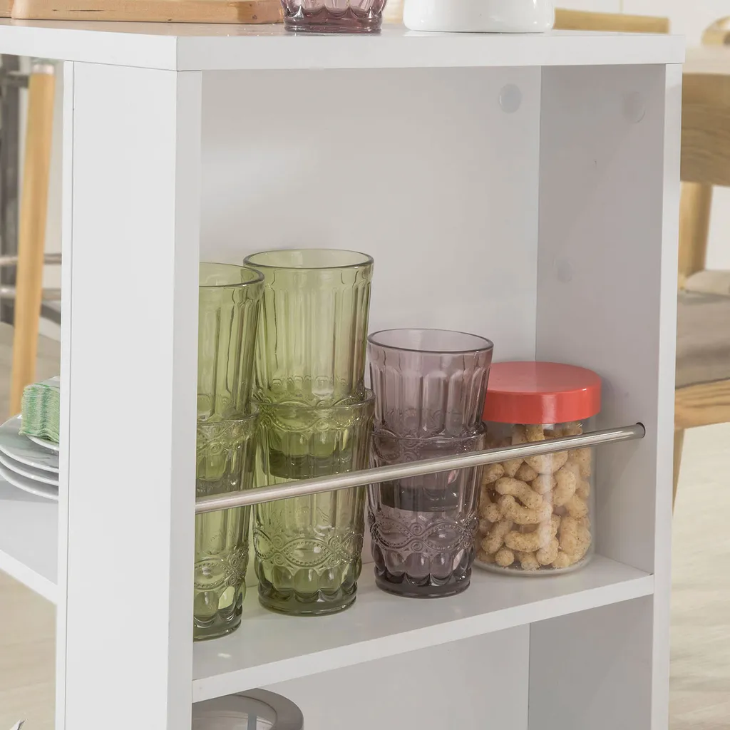 Die 3 offenen Ablagen und 2 seitlichen Regalfächer bieten viel Stauraum für verschiedenste Utensilien in Ihrer Küche oder jedem anderen Zimmer.