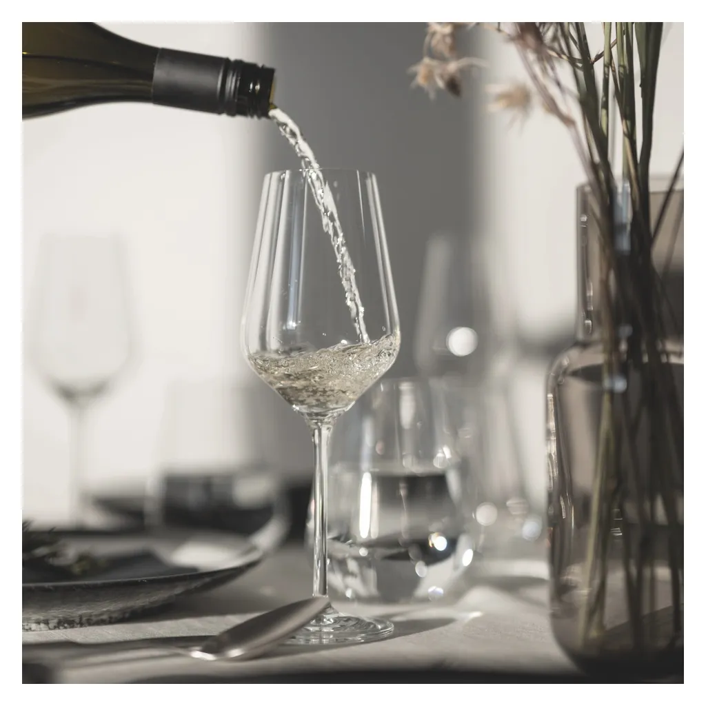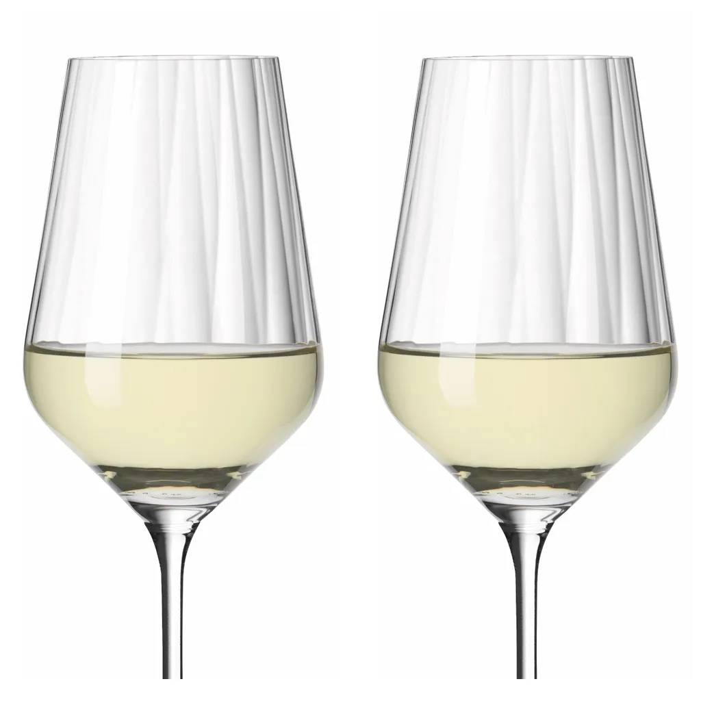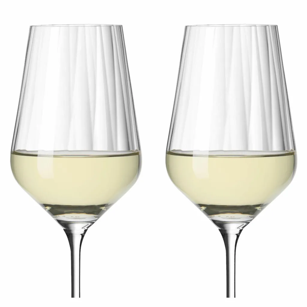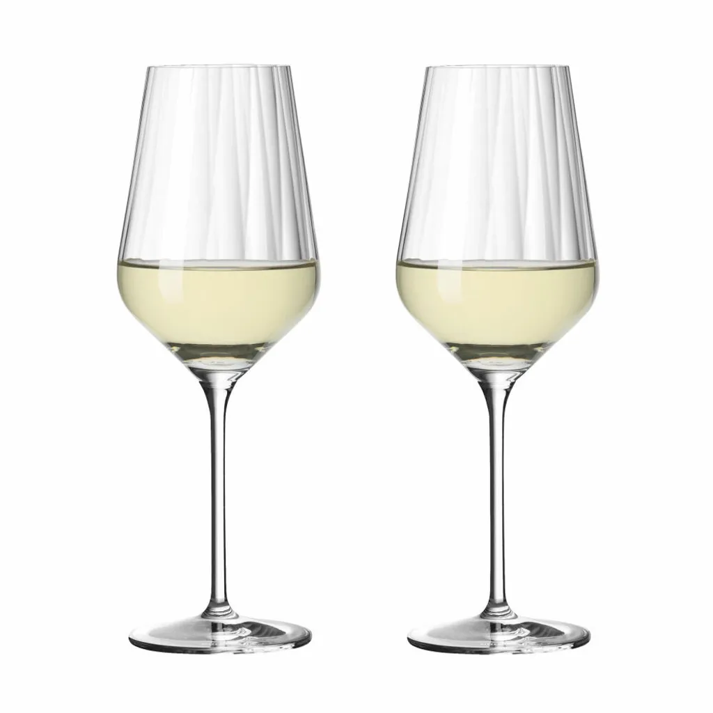 Pure Formsprache ‐ präzise im Detail: Das Weißweinglas‐Set ist mit einer innenliegenden Reliefstruktur aufwendig gearbeitet und lässt ein Wechselspiel von Licht und Schatten entstehen.