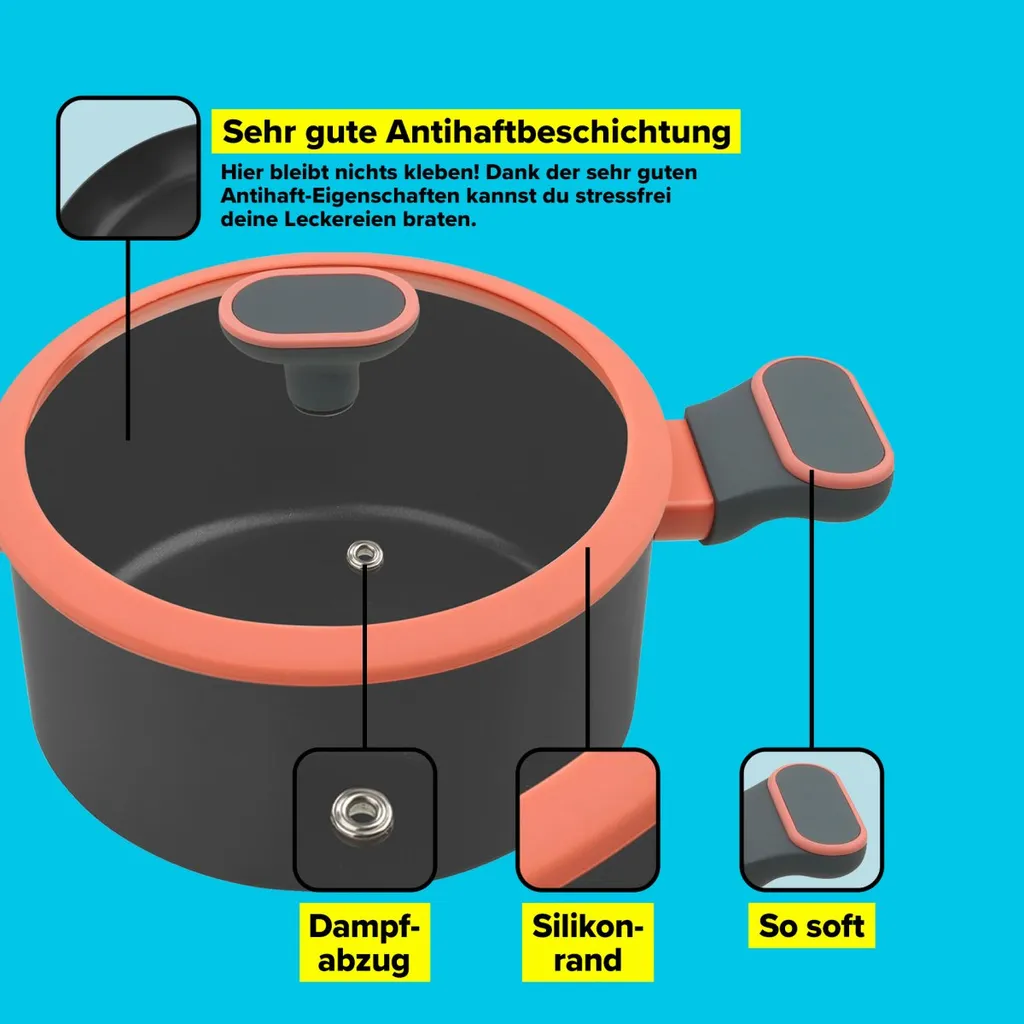Was muss ein guter Kochtopf können? Der Tasty Antihaft-Kochtopf (Ø 20 cm). Er hat die perfekte Größe für alles, was gekocht werden kann. Die Softtouch-Griffe und der Knauf am Deckel liegen dabei bequem in der Hand und machen in einer coolen Kombination aus Orange und Grau ordentlich was her. Der Kochtopf ist natürlich für alle Herdarten inklusive Induktion geeignet.