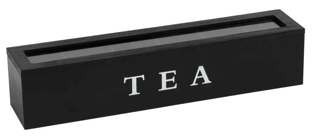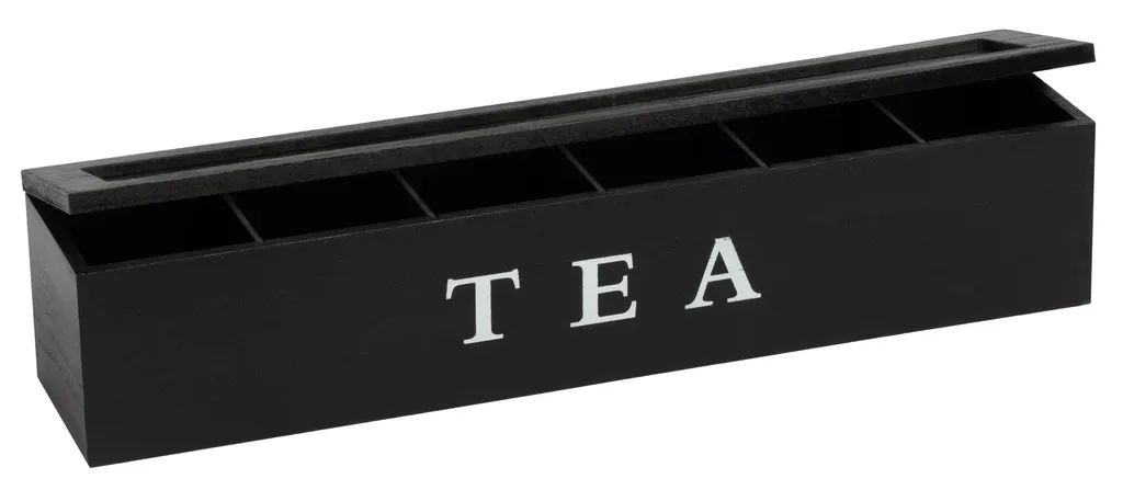 Deze zwarte theedoos heeft plaats voor 6 verschillende soorten thee. Voor ieder wat wils! Door de handige glazen deksel kun je snel je eigen favoriete smaak vinden.