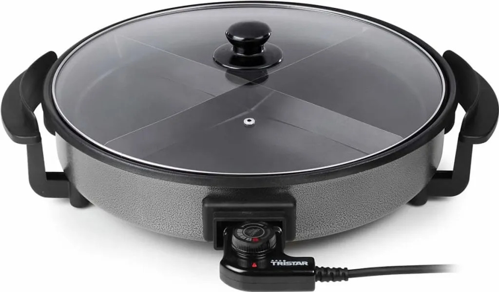 Nicht immer steht dir zum Kochen ein Herd zur Verfügung – doch das ist mit der Tristar Party-Pfanne kein Problem für dich. Sofern eine Steckdose in der Nähe ist, bereitest du in ihr eine große Vielzahl deiner Lieblingsgerichte zu. Die runde Pfanne misst 15 cm in der Höhe und 40 cm im Durchmesser. Sie besitzt einen transparenten Deckel, sowie zwei praktische Handgriffe.