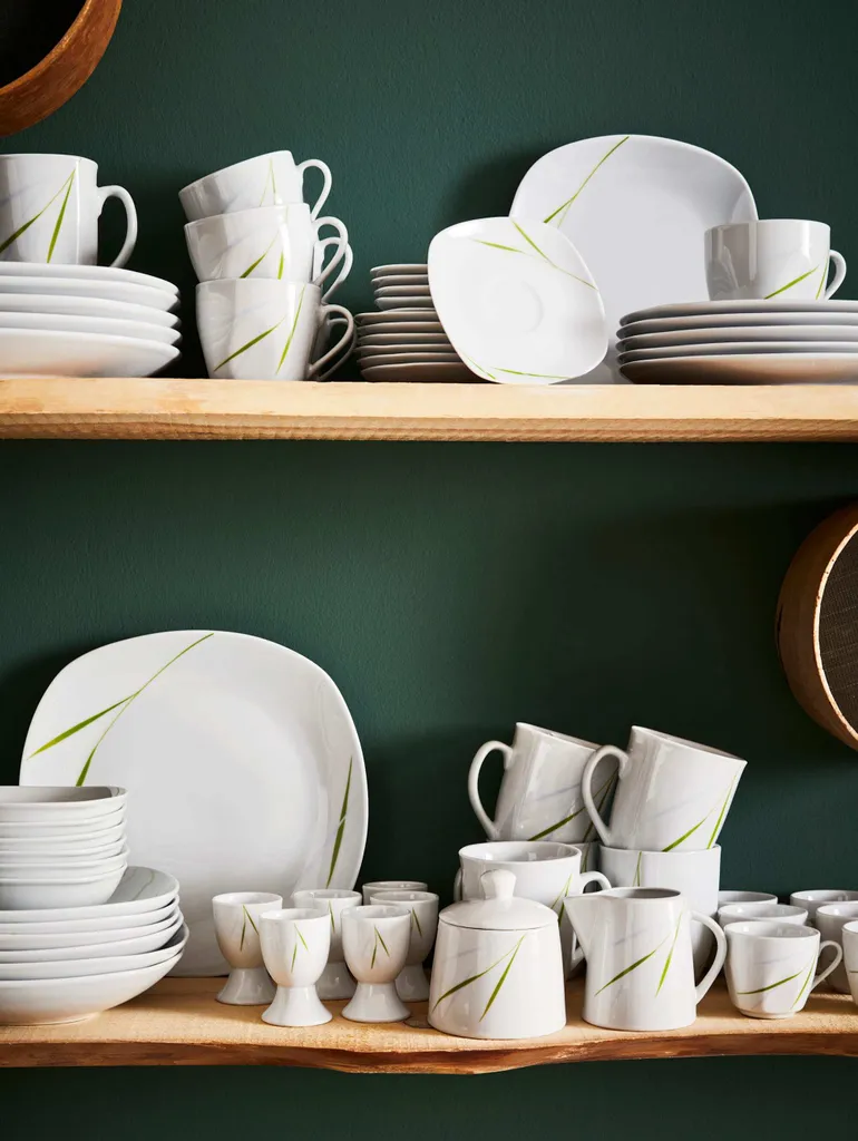 62tlg. Kombiservice ‚Aviva‘ von vanWell. Moderne eckige Form mit abgerundeten Ecken. Aus hochwertigem weißen Porzellan mit modernem Gräserdekor. Spülmaschinen- und mikrowellengeeignet. Für 6 Personen. Bestehend aus: