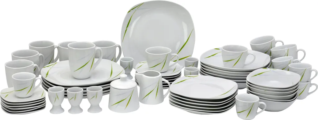 Dieses 62-teilige Kombiservice in eckiger Form ist weiß und mit einem Gräserdekor verziert. Das Porzellan ist spülmaschinen- und mikrowellengeeignet. Das Set beinhaltet einen Gießer, eine Zuckerdose, Tassen und Untertassen, Dessertteller, Essteller, Kaffe- und Eierbecher, Müslischalen sowie Espressotassen.