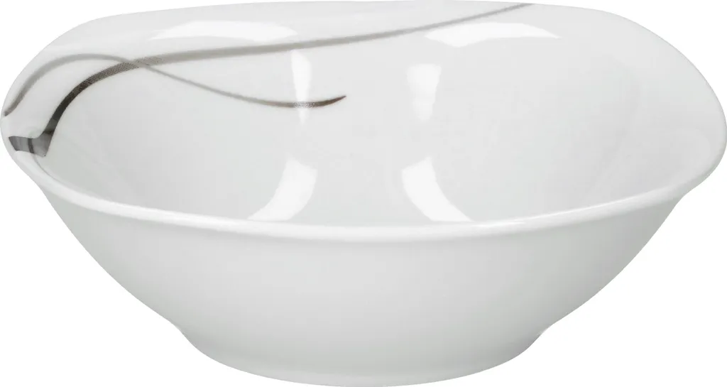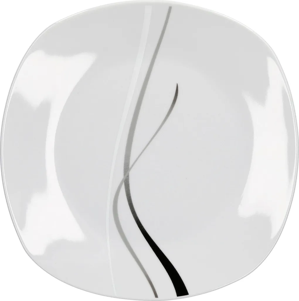 Kombiservice 62 tlg. Silver Night, eckige Form, weiß mit grauen Linien, Porzellan, spülmaschinen- und mikrowellengeeignet, im 4-Farbdruck- karton bestehend aus: 1 Gießer 23,0 cl, 1 Zuckerdose 28,0 cl, 6 Obertassen 18,0 cl, 6 Untertassen 14,5 cm, 6 Dessertteller 19,0 cm, 6 Eßteller tief 21,5 cm, 6 Eßteller flach 25,0 cm, 6 Müslischalen 14,2 cm, 6 Kaffeebecher 33,0 cl, 6 Eierbecher 4,8 cm, 6 Espresso-Obertassen 11,0 cl und 6 Espresso-Untertassen 12,3 cm
